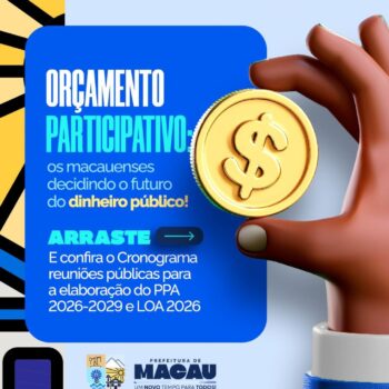 A Prefeitura de Macau convida toda a população para participar do Orçamento Participativo, um importante instrumento de democracia direta que garante aos cidadãos a oportunidade de decidir o futuro do dinheiro público. Através de reuniões públicas, os macauenses poderão apresentar propostas, debater prioridades e contribuir na elaboração do Plano Plurianual (PPA) 2026-2029 e da Lei
