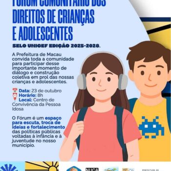 O município de Macau realiza nesta quinta-feira, 23 de outubro, o 1º Fórum Comunitário do Selo UNICEF – Edição 2025-2028, promovido pelo Conselho Municipal dos Direitos da Criança e do Adolescente (CMDCA) em parceria com a Prefeitura Municipal. O encontro acontece a partir das 8h, no Centro de Convivência da Pessoa Idosa Afonso Delmiro, e