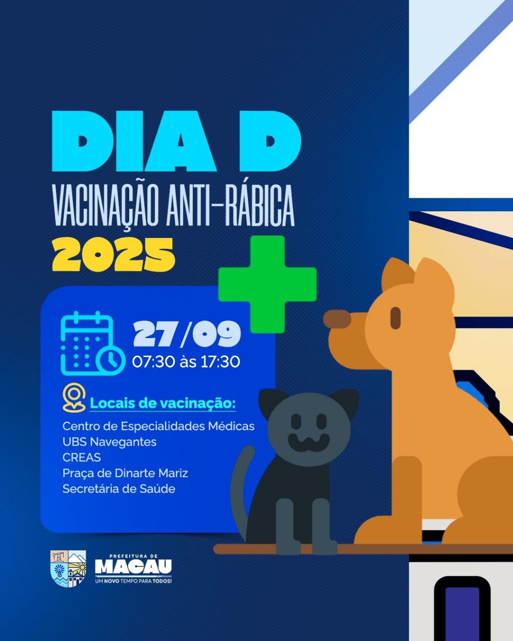 A Prefeitura de Macau, por meio da Secretaria Municipal de Saúde, promove neste sábado, 27 de setembro, o Dia D de Vacinação Antirrábica 2025. A