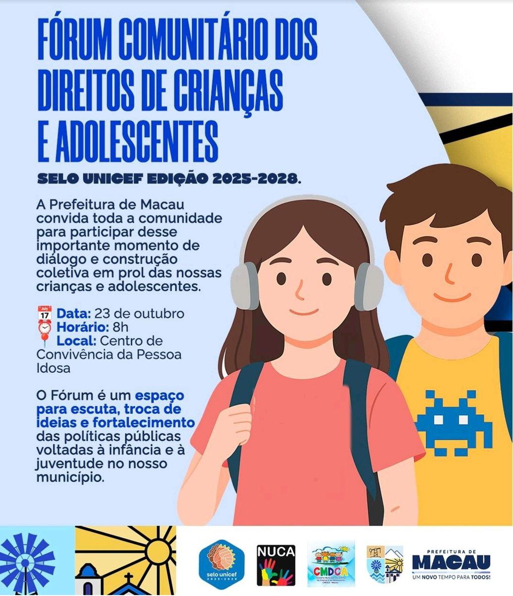 O município de Macau realiza nesta quinta-feira, 23 de outubro, o 1º Fórum Comunitário do Selo UNICEF – Edição 2025-2028, promovido pelo Conselho Municipal dos